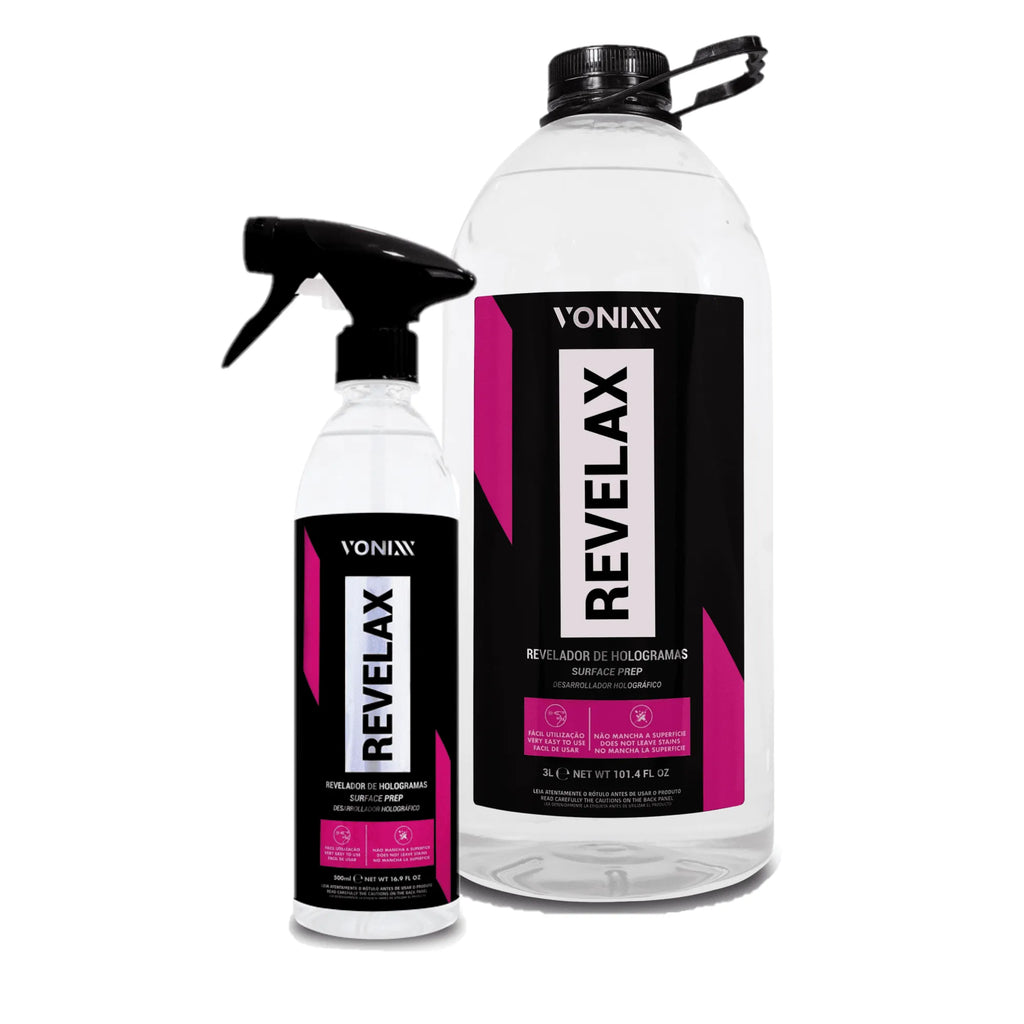 Revelax evidencia defeitos da pintura, como hologramas e swirls mascarados por ceras, selantes e polidores. É também recomendado para limpeza de vidros e descontaminação de plásticos, principalmente antes da aplicação de V-Plastic, removendo produtos como silicones e contaminações diversas. Seu uso deixa a peça pronta para inspeção antes de qualquer trabalho.